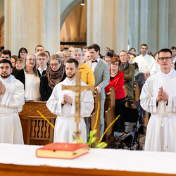 Am 10. Mai weihte Weihbischof Franz Scharl in der Pfarrkirche St. Leopold Donaufeld sieben Männer zu Diakonen für die Erzdiözese Wien. Die Kandidaten kommen aus verschiedenen Gemeinschaften: drei aus dem Wiener Priesterseminar, einer aus dem Benediktinerpriorat St. Josef in Maria Roggendorf und drei aus dem diözesanen Missionskolleg „Redemptoris Mater". Manuel Rennhofer, Joachim Loshehand und Julius Moses Münzer kommen aus dem Wiener Priesterseminar, P. Leo Maria Zehetgruber gehört dem Benediktinerpriorat St. Josef in Maria Roggendorf an drei weitere Kandidaten stammen aus dem diözesanen Missionskolleg „Redemptoris Mater“. Diese Vielfalt unterstreicht die Breite der geistlichen Berufungen in der Erzdiözese. Wir waren mit der Kamera dabei.